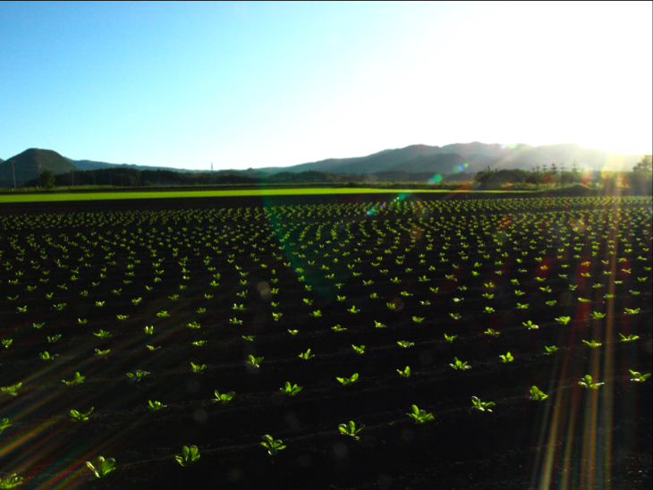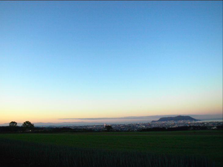 夕刻、あまりに空の色が美しいので居てはいられずカメラを持って飛び出す。視界の開けた畑につく。ファインダーをのぞくことに夢中になっていると「良い絵とれた?」と声をかける人。目を向けると近くの美容室のお姉さん(グレープさん)だ。旦那さんと一緒に犬のお散歩の途中の様子である。「稜線が綺麗ね、私たちも写真を撮りたいくらいねと話してたのよ」とグレープさんがいう。夫婦でこの町に住んで、それぞれに思い思いの仕事をして、日暮れには一緒に話しながら散歩。そんなふうにゆったり過ごしてる二人の生き方は私の目には贅沢で丁寧な生活に見えた。そして二人は柔らかい空気に覆われているように感じられた。ああ、いいなぁ、と思う。「こんにちは、あまりに美しくて飛び出してきたんです。でも目で見るようにカメラではとれなくて」私はグレープさんと話していて二人の年下のいとこみたいな気持ちになった。冗談を言い合い、笑いながら散歩に戻った二人はこの風景にぴったりだな、と思った。